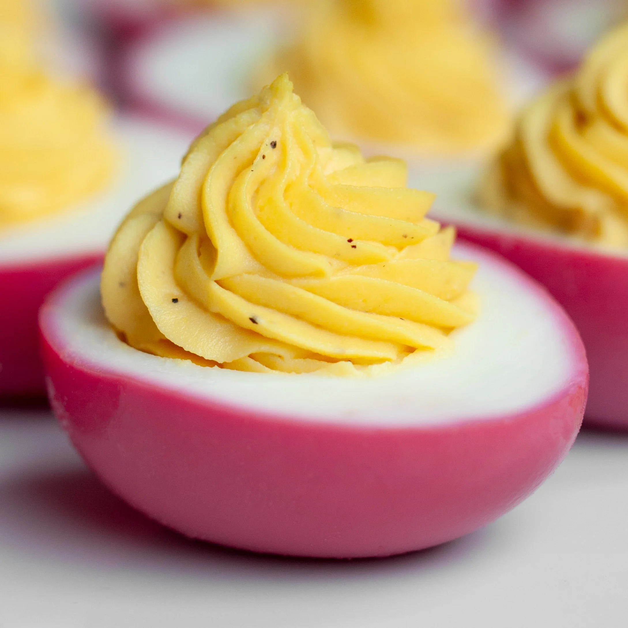 Place a dozen eggs in a pot. Fill pot with enough water to cover eggs by 1 inch. Bring pot to a boil and remove from heat. Cover pot and allow to steam for 18 minutes. Drain water and place eggs in an ice bath until cool. Peel eggs and return to pot. Pour 32 oz of beet juice over eggs and let it sit for 30 minutes to 1 hour. Drain beet juice, pat eggs dry, and cut eggs in half. Carefully remove and reserve the egg yolks for the filling.