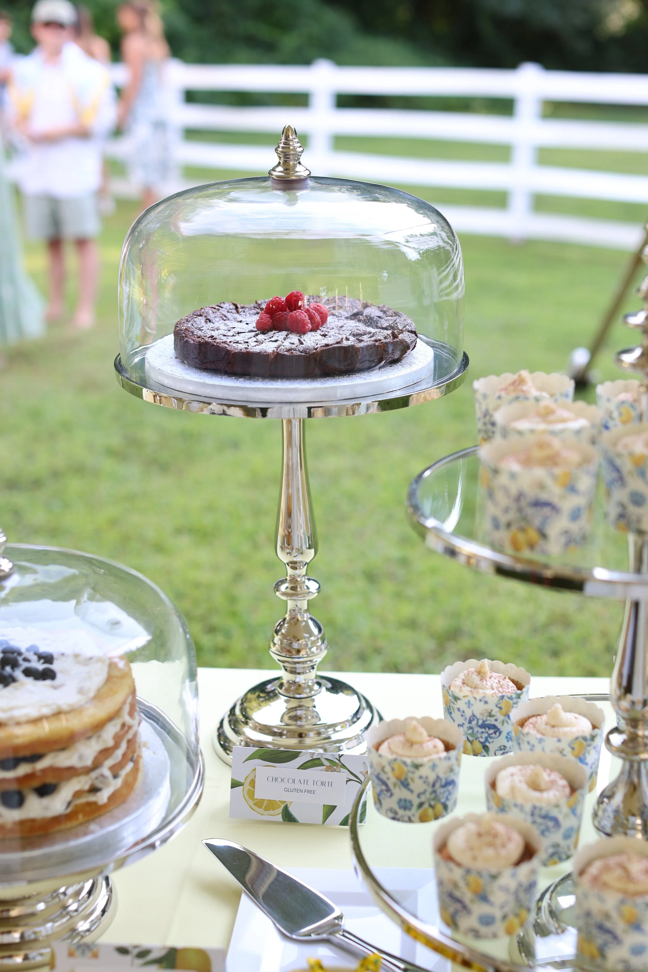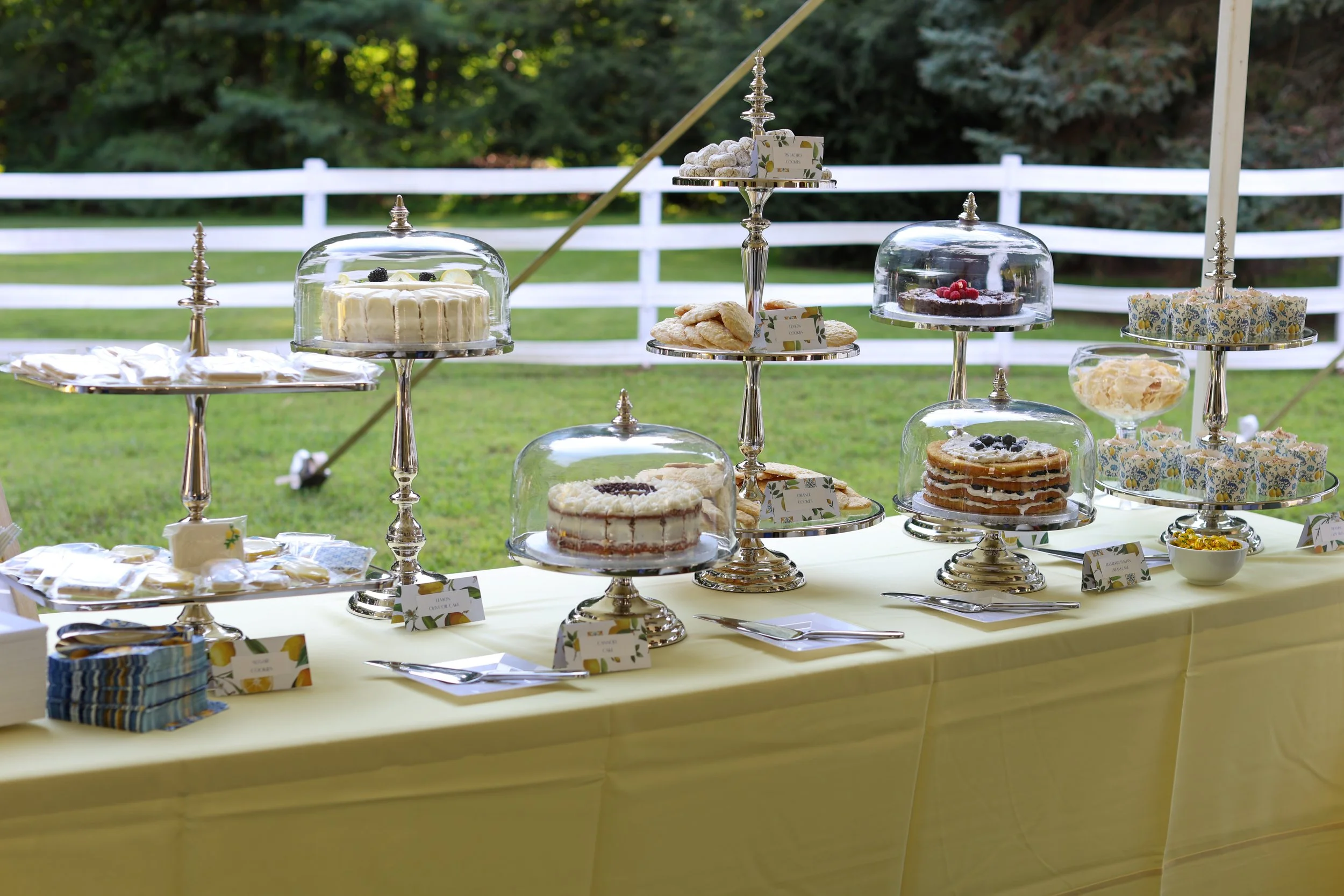 The display was as much a feast for the eyes as it was for the taste buds. Tall silver cake stands gleamed under the summer light, each cake showcased beneath an elegant glass dome. Tiered trays held cookies and confections, while custom dessert cards in a lemon-and-leaf motif identified each sweet.