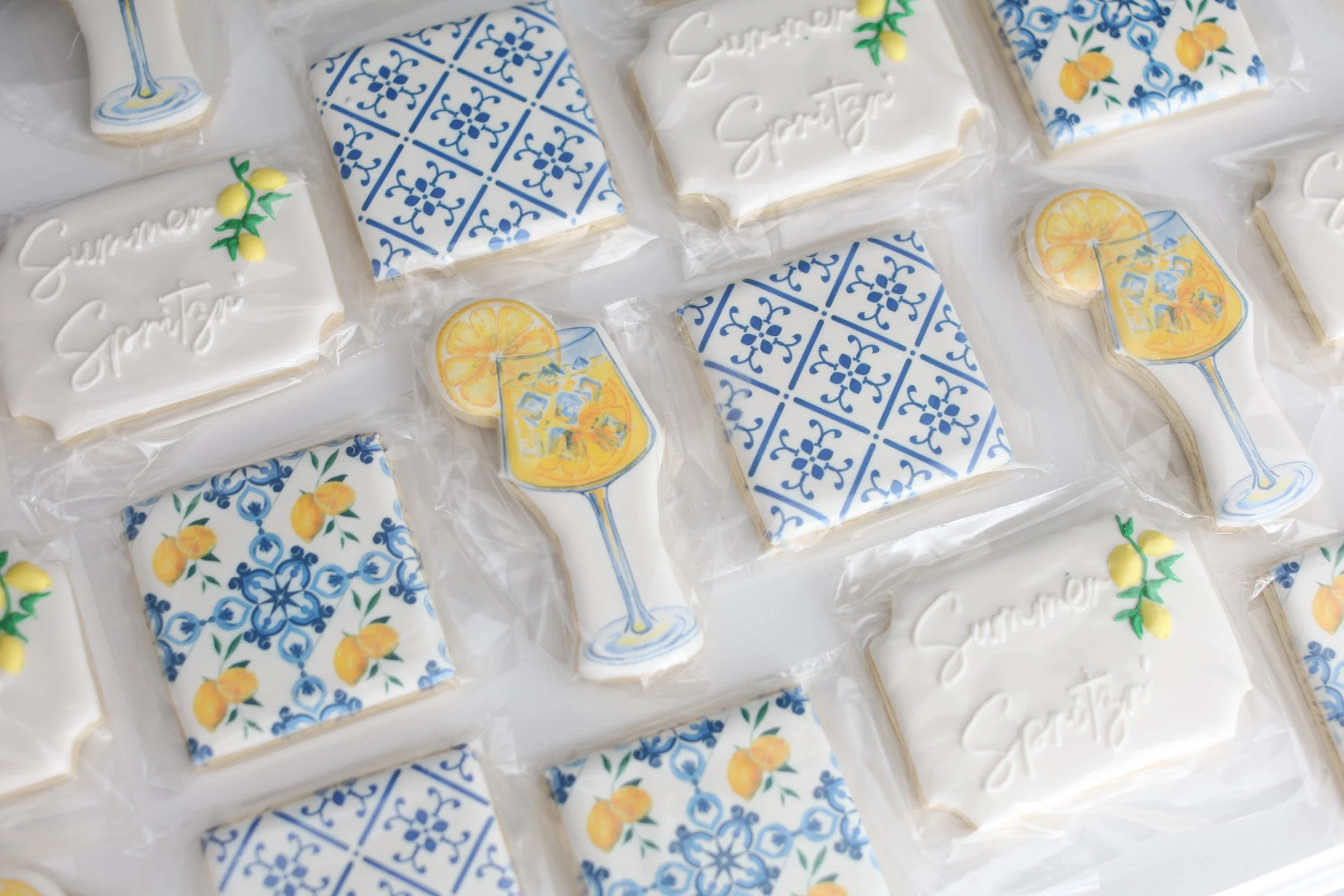 Custom Designed Spritz Cookies – Buttery, custom-decorated and shaped sugar cookies designed to match the spritz glass and decor from the party invitation - an edible detail to the event’s signature drink and style.